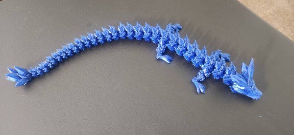 All flexi dragons made with PETG filament (Polyethylene Terephthalate Glycol-modified) is a popular, durable, and versatile 3D printing material known for bridging the gap between the ease of use of PLA and the strength of ABS. It is a glycol-modified version of PET. It's waterproof and uv proof. Size of dragons are around 12" Or bigger.